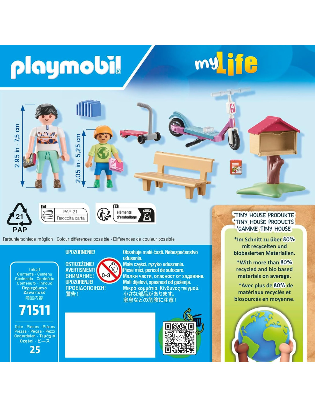 El intercambio de libros de PLAYMOBIL es ideal para los amantes de los libros. En el armario de intercambio de libros, siempre hay nuevas y emocionantes historias por descubrir. Madre e hijo dan un pequeño paseo en sus scooters y se toman un descanso en la biblioteca para elegir una nueva lectura. El niño devuelve el libro ya terminado en la casa. El mundo de juego del Tiny House de PLAYMOBIL invita a niñas y niños a participar de manera lúdica en los temas de sostenibilidad y protección del medio ambiente. Especificaciones: - Set de juego diseñado con dos figuras de PLAYMOBIL, una casa de libros con un estante, una pila de libros, tres libros, un banco y otros fantásticos extras. - PLAYMOBIL Tiny House está fabricado con más de un 80% de productos sostenibles.