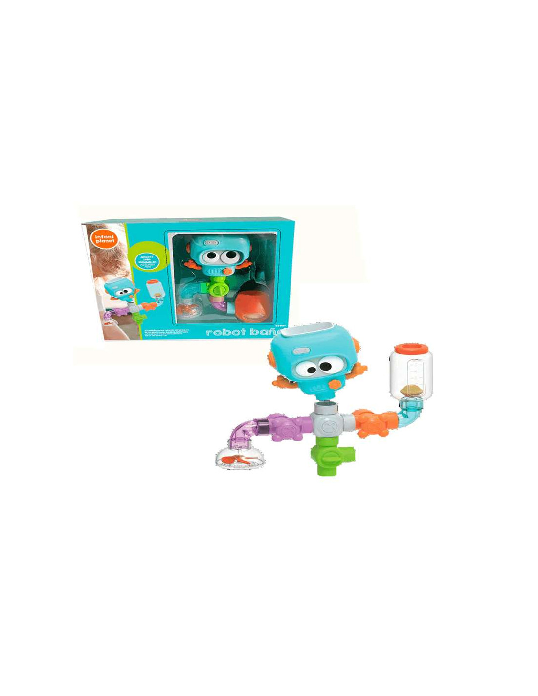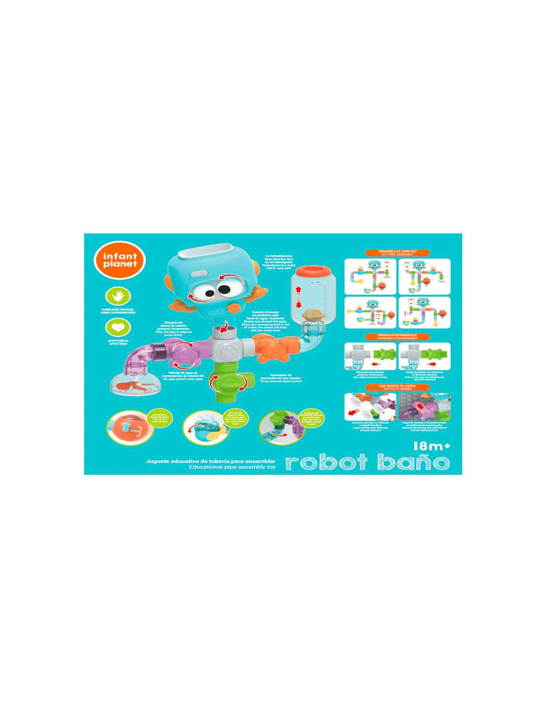 Infant PlanetRobot baño – Juguete educativo de agua para ensamblar es un divertido set de 27 piezas con el que los peques pueden construir su propio circuito de agua y descubrir cómo funcionan las tuberías, válvulas y engranajes. Perfecto para disfrutar en la bañera o en juegos de agua, este juguete combina aprendizaje, experimentación y mucha diversión.