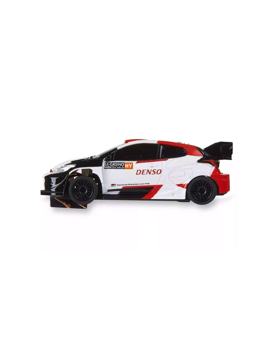 Incluye: 1 coche Toyota Yaris WRC con luces, 1 coche Ford Puma WRC con luces, 2 controladores con turbo, 1 circuito construible Fast Rally con looping, puente, vallas y más detalles geniales.