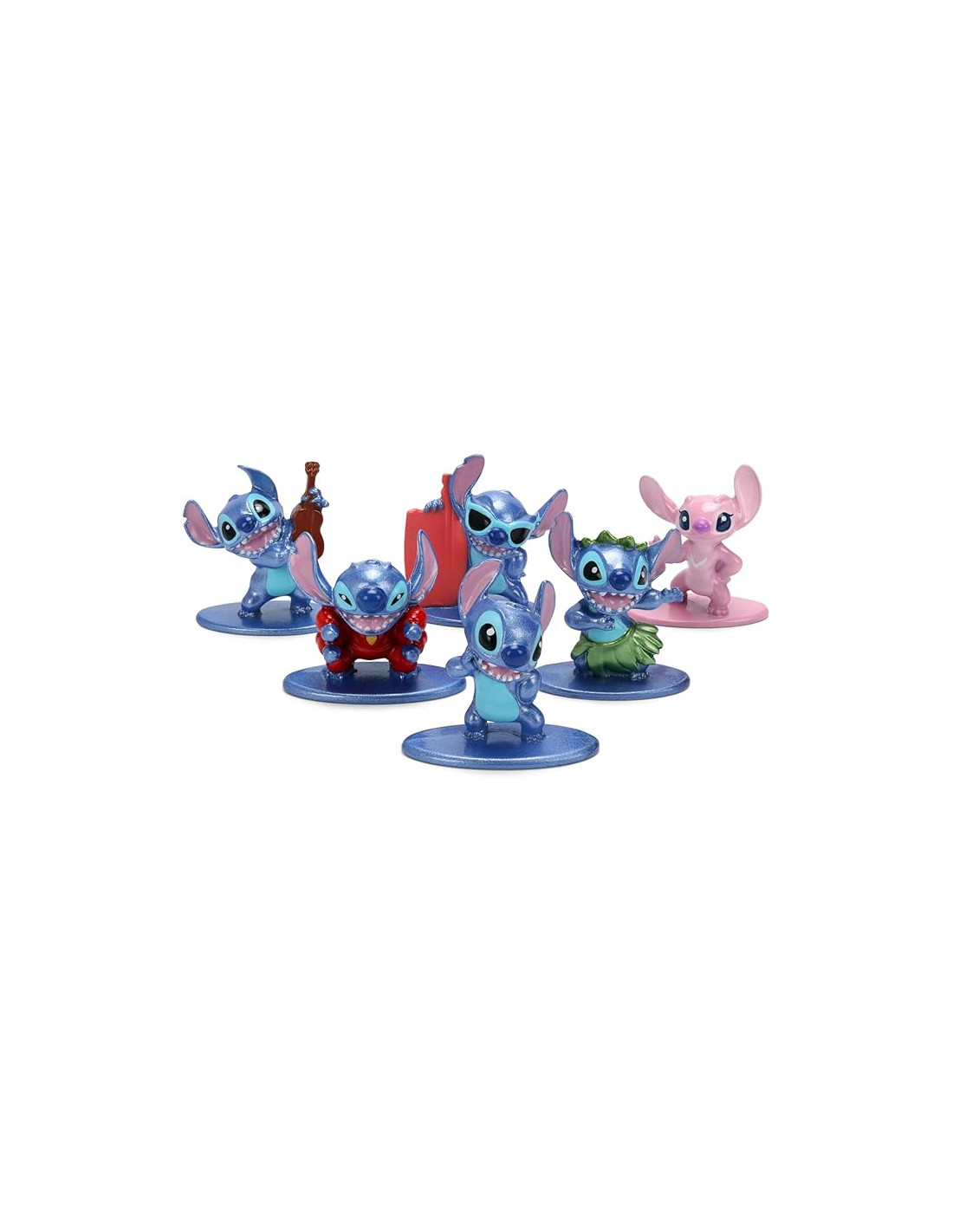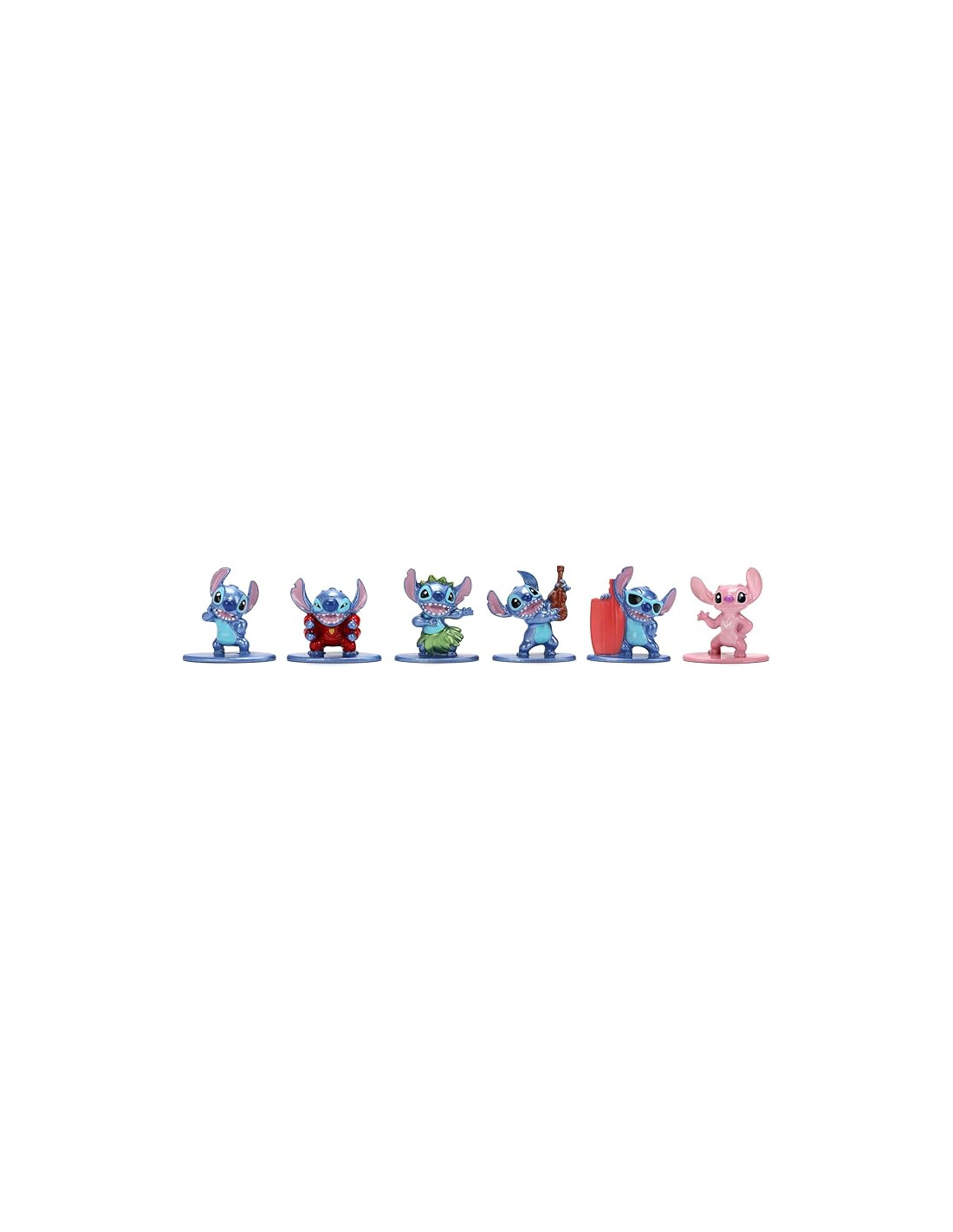SimbaColección oficial Disney Lilo & Stitch en formato nano; set de 6 figuras metálicas de 4 cm que muestran a Stitch en sus versiones más icónicas: clásico, surfero, hula, con ukelele, traje espacial rojo y acompañado por Angel, su inseparable amiga