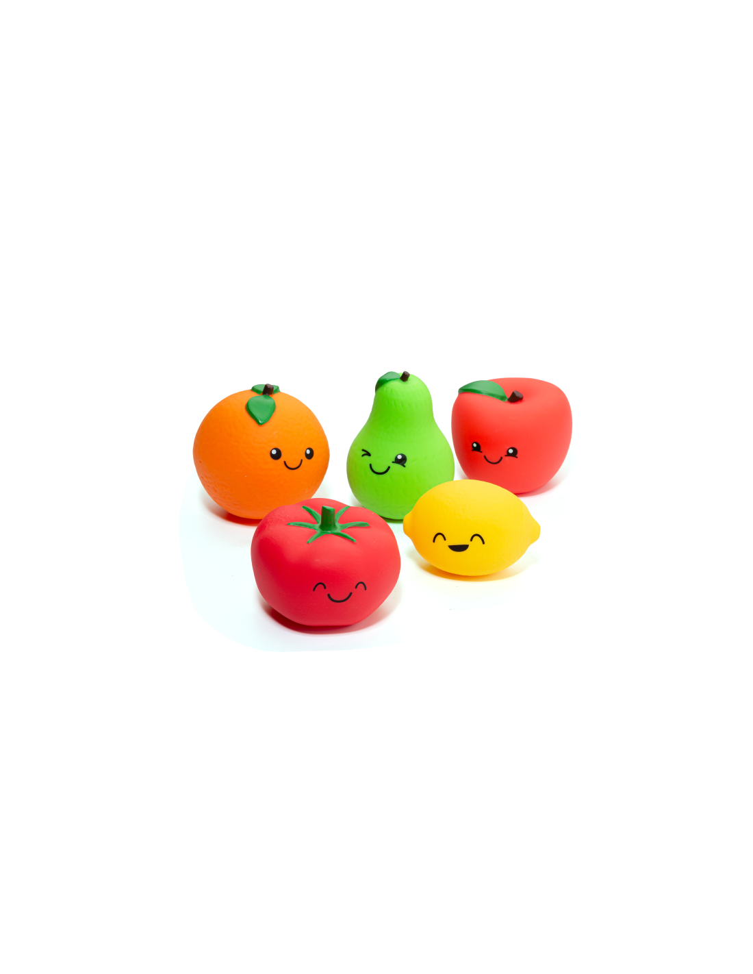 SENSORIAL FRUITS - 5 PCS. Incluye 5 frutas: manzana, pera, limón, naranja y tomate. Fáciles de agarrar y suaves al tacto, con colores, texturas y formas llamativas que estimulan los sentidos y el desarrollo infantil.
