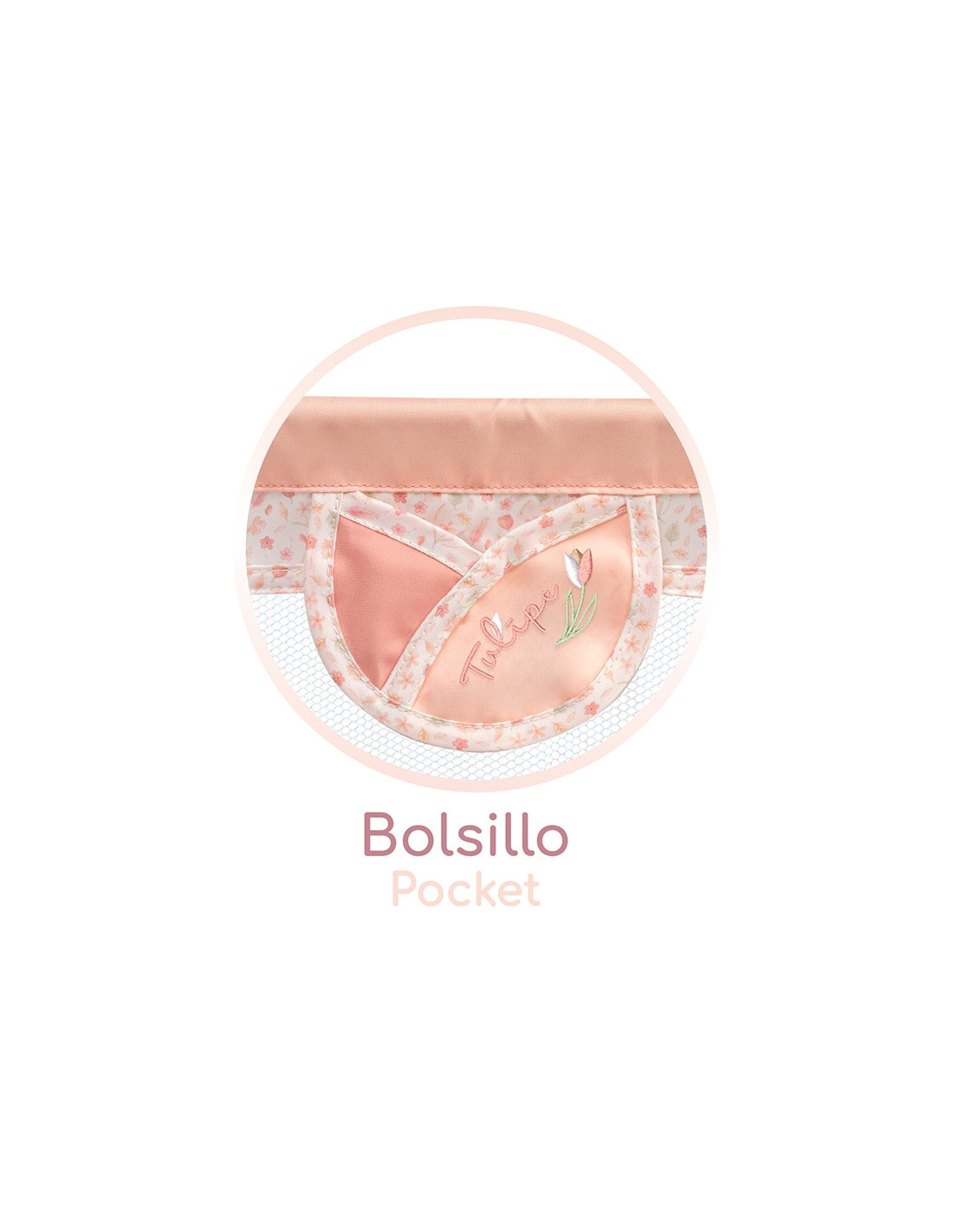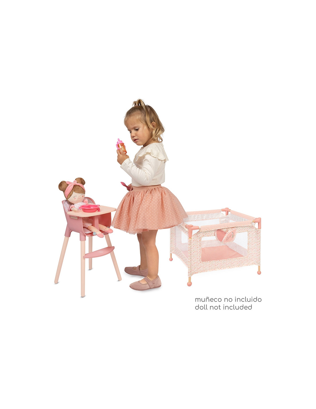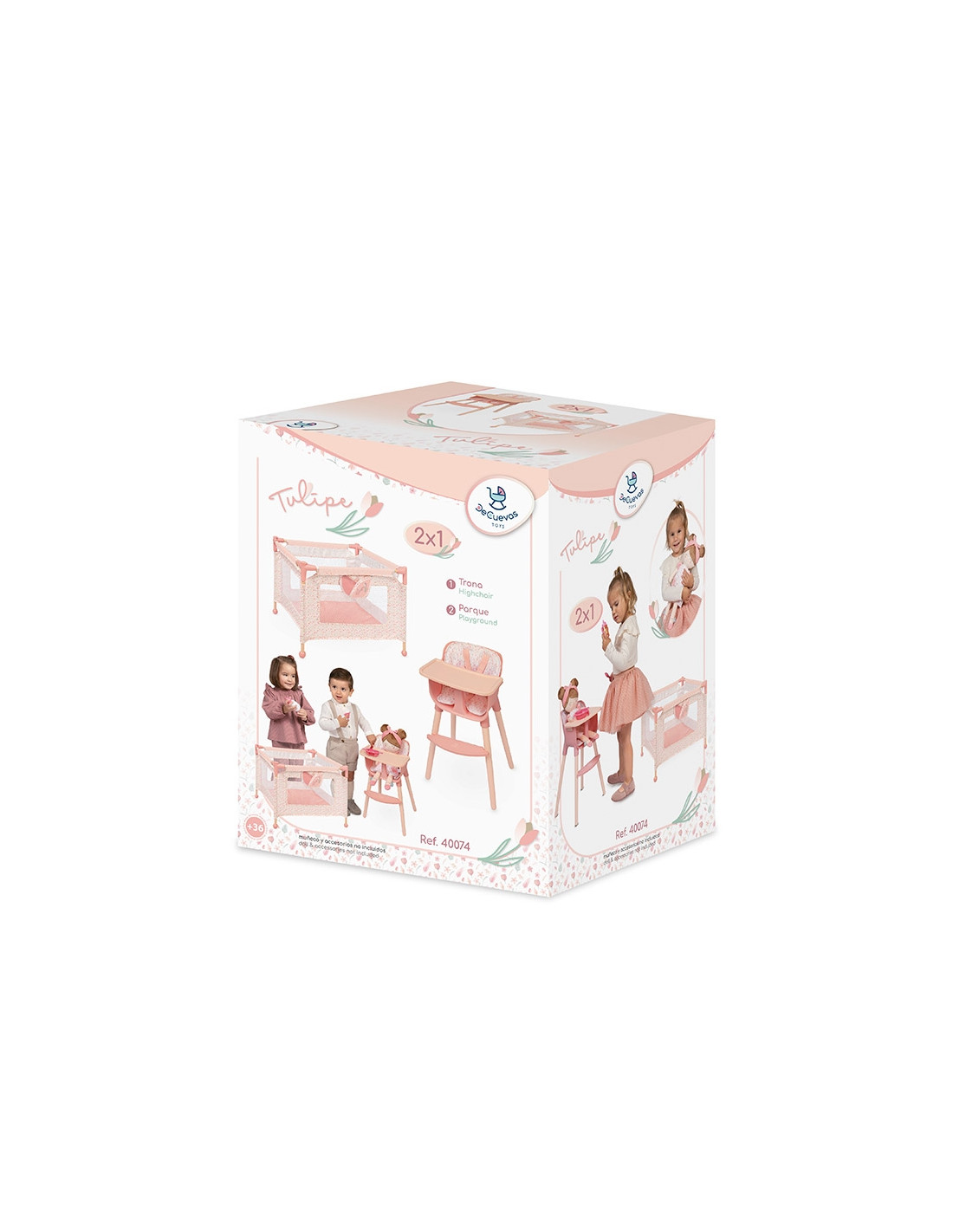 Incluye: 1 trona de color rosa y blanca con estampado especial de la linea Tulipe con bandeja extraible, cinturón de seguridad, tela acolchada y muchos más detalles de lujo y 1 parque de juegos para muñecas de color rosa y blanco con estampado especial de la linea Tulipe con bolsillo, gran espacio interior y mas detalles de lujo.
