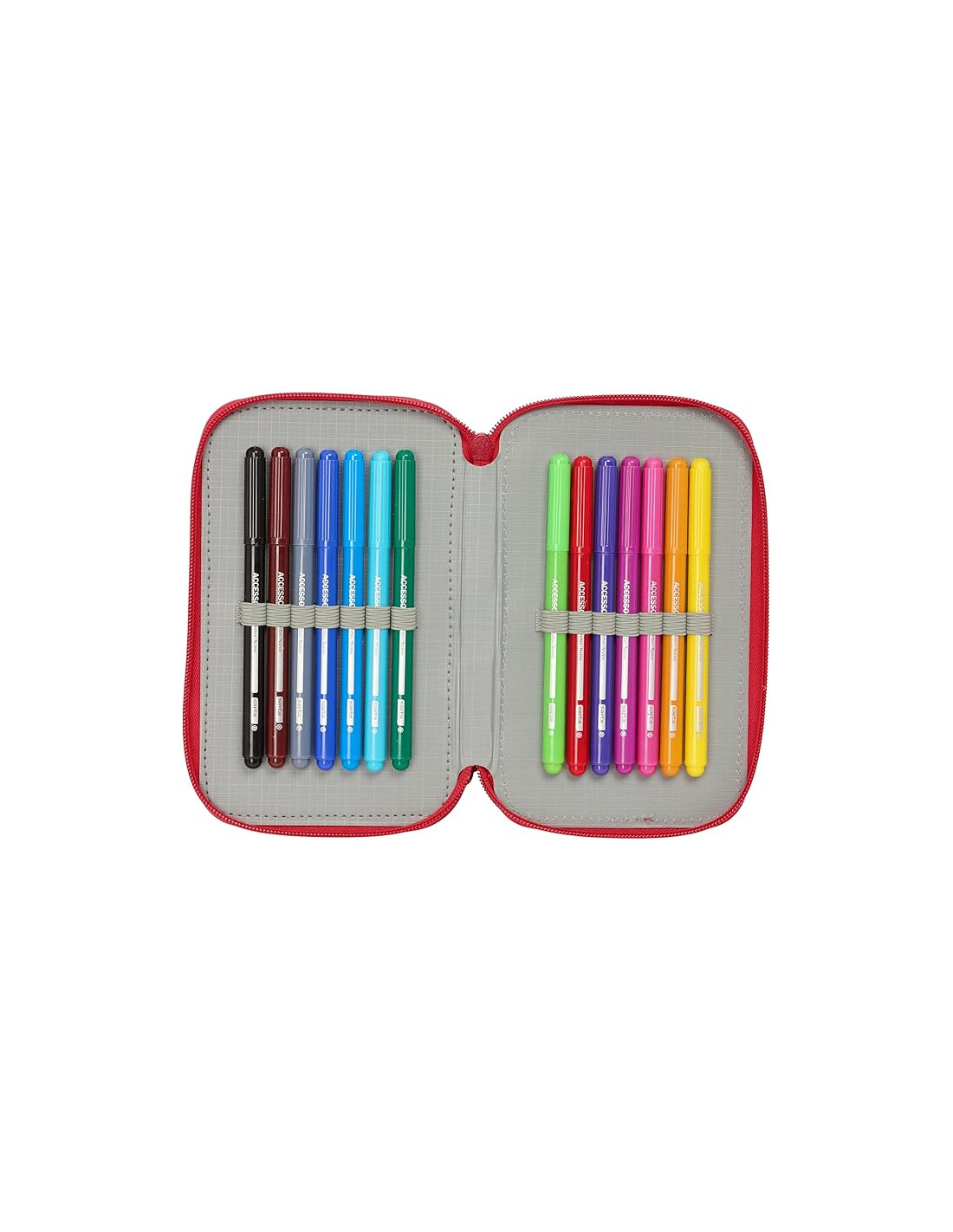 ESPACIOSO Y LIGERO: Contiene 37 piezas: goma, lápiz de grafito, bolígrafo azul-rojo, sacapuntas, regla azul, grabada y semicírculo (1er compartimento). 16 colorines de madera (2º compartimento). 14 rotuladores de colores (3º compartimento). Tiradores en los cursores para facilitar su apertura. Medidas: Ancho 125mm. Largo 55mm. Alto 195mm. Capacidad 1,3L. Peso 0,44 Kg