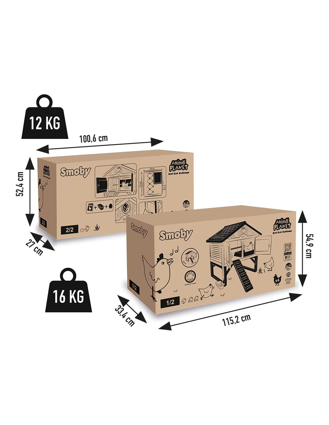 Equipado con un amplio palo de gallinero, una canaleta para recoger agua de lluvia y un recipiente para su recolección. También se incluye un huevo de plástico y un divertido folleto para niños.