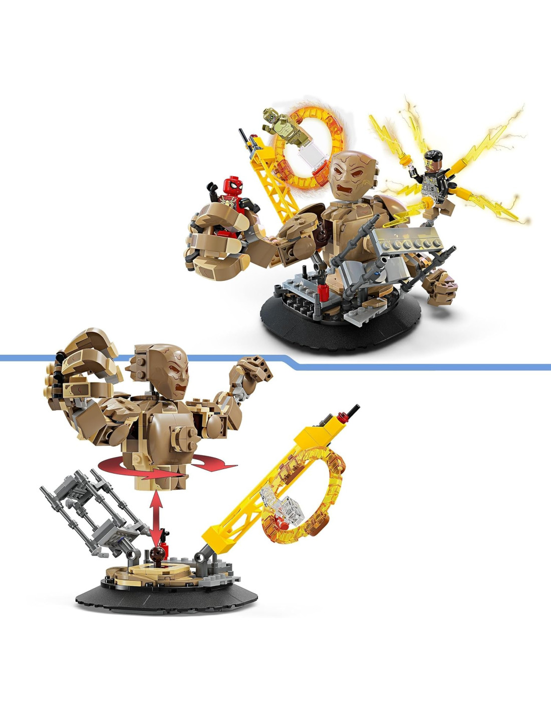 Juguete LEGO® de combate construible para peques: Los jóvenes fans de Marvel pueden mover y girar las articulaciones de Sandman y usar sus enormes manos para agarrar a Spider-Man mientras pasa por encima balanceándose de su “cuerda” arácnida flexible