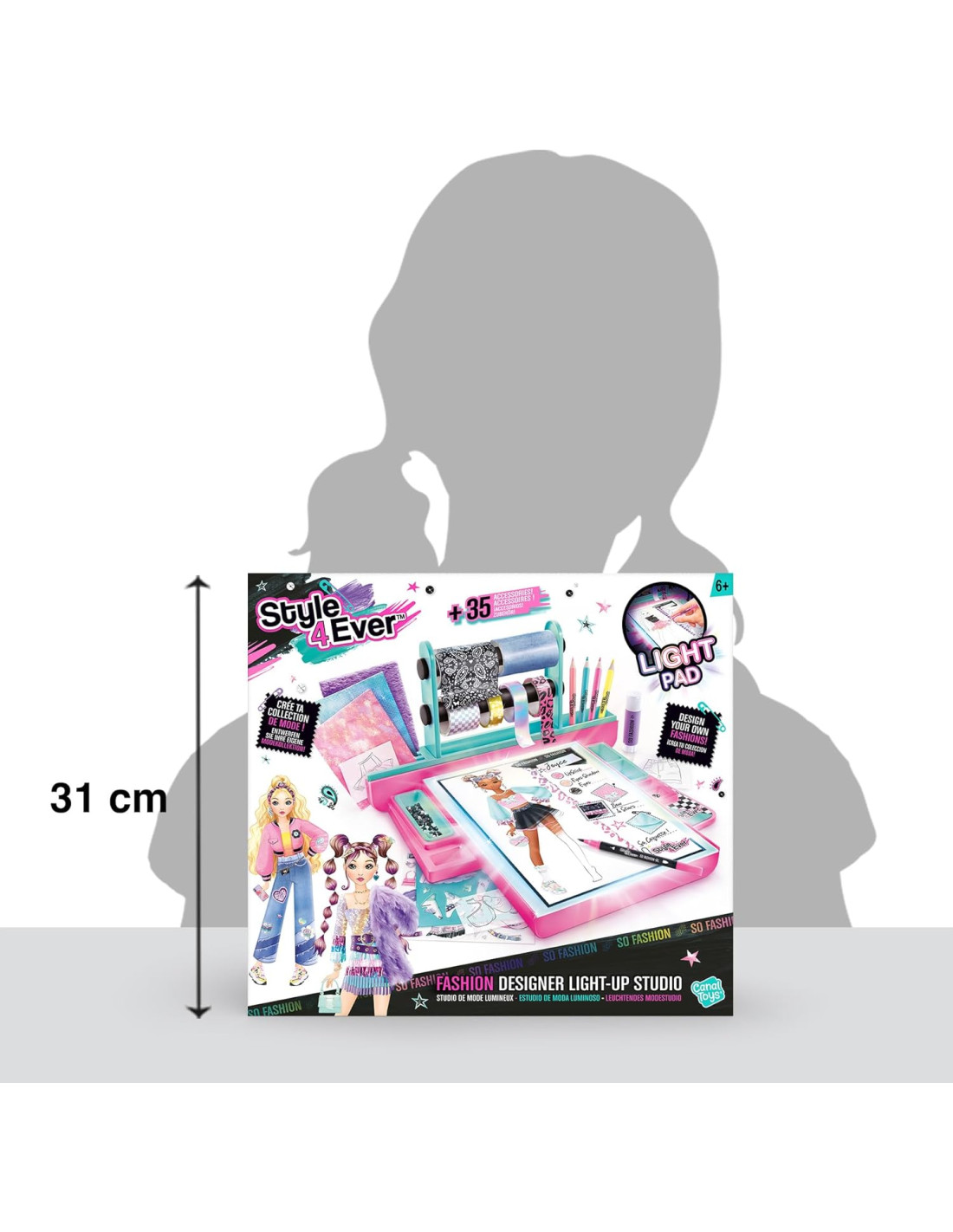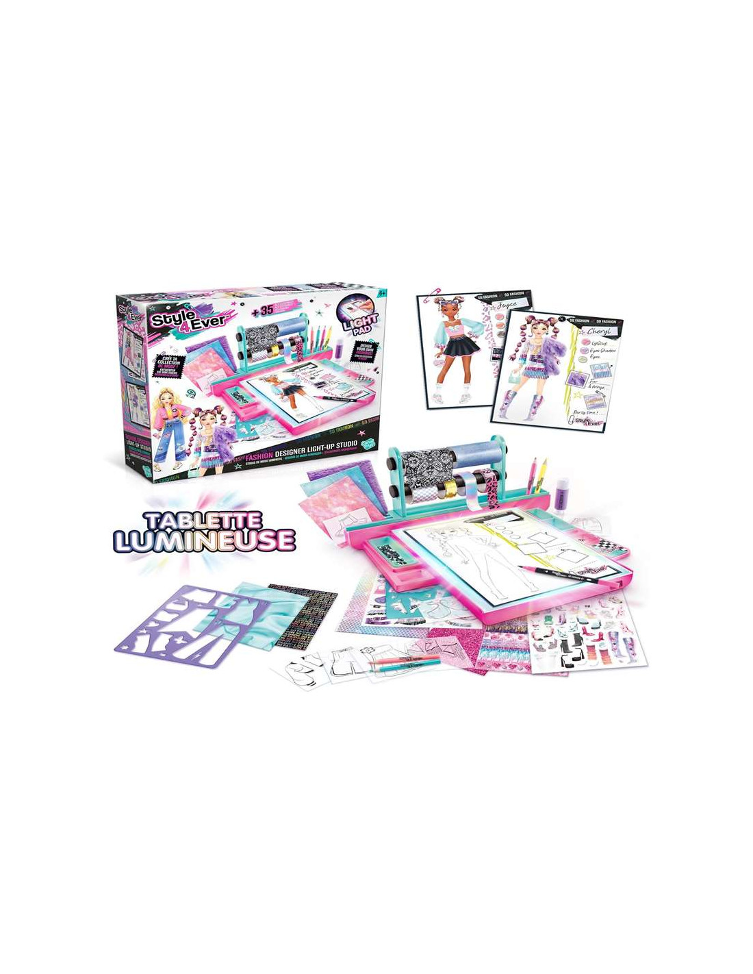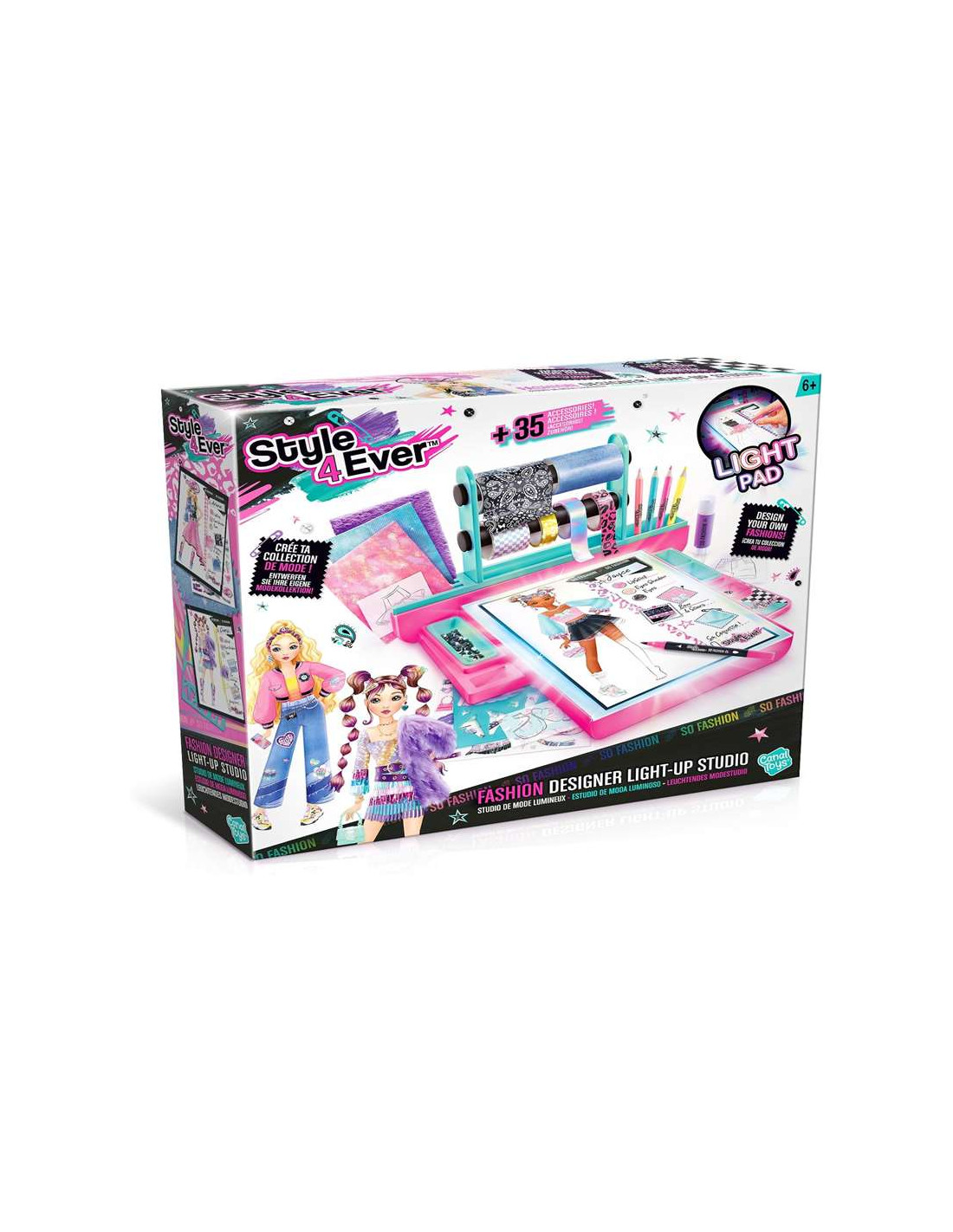 Canal Toys¿Te encanta la moda? Crea tus atuendos de ensueño desde cero. Utiliza el tablero de retroiluminación integrado para trazar, dibujar y dar vida a tus ideas con facilidad.