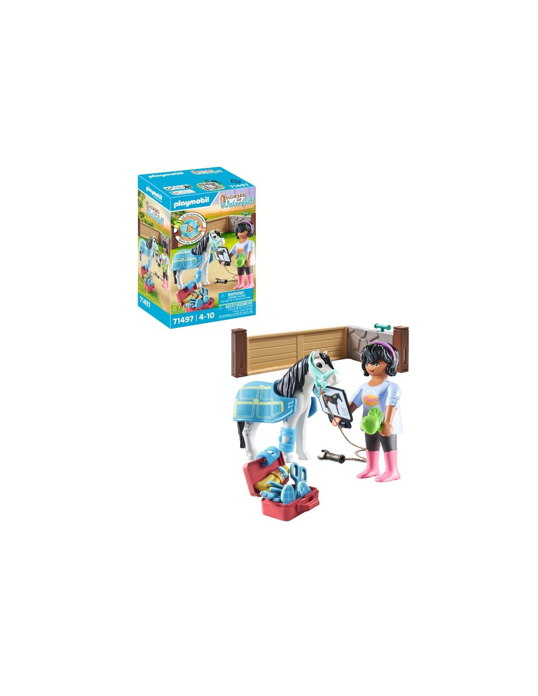 En el Rancho Waterfall el Terapeuta de Caballos cuida de los ponis. El terapeuta examina cuidadosamente al caballo para descubrir qué le pasa. Parece que está lesionado. El terapeuta aplica un vendaje y calma al animal con suaves caricias. Pronto, todo estará bien. Especificaciones: - Juguete de PLAYMOBIL diseñado con figura de PLAYMOBIL, poni, manta para caballos, vendajes, cabezada y muchos otros accesorios para el cuidado de caballos. - Incluye una hoja de etiquetas con cintas de fisioterapia para tratar a los caballos. - Un gran regalo o recuerdo para los aficionados a la equitación a partir de 4 años. - Horses of Waterfall de PLAYMOBIL está fabricado con más de un 80% de productos sostenibles.