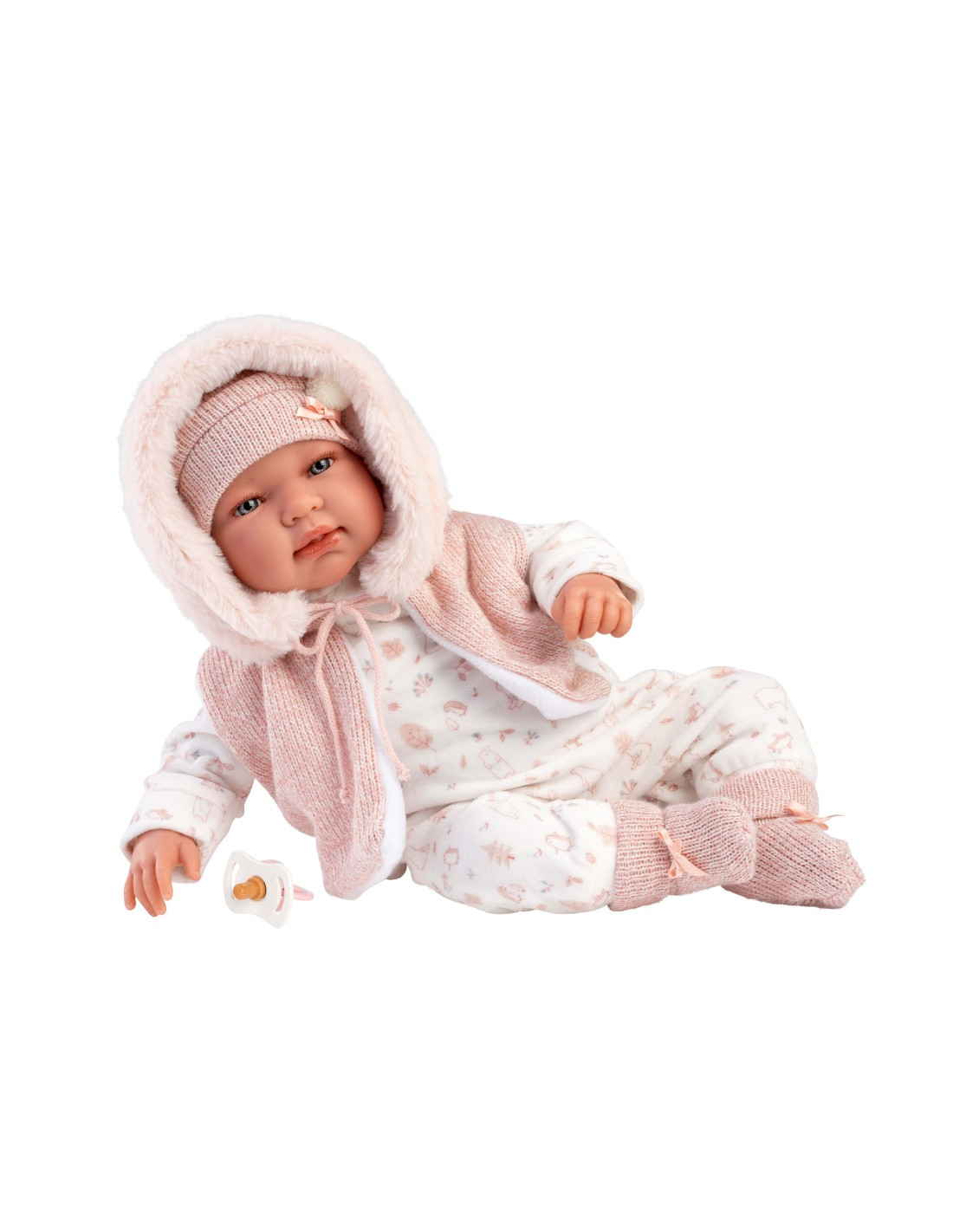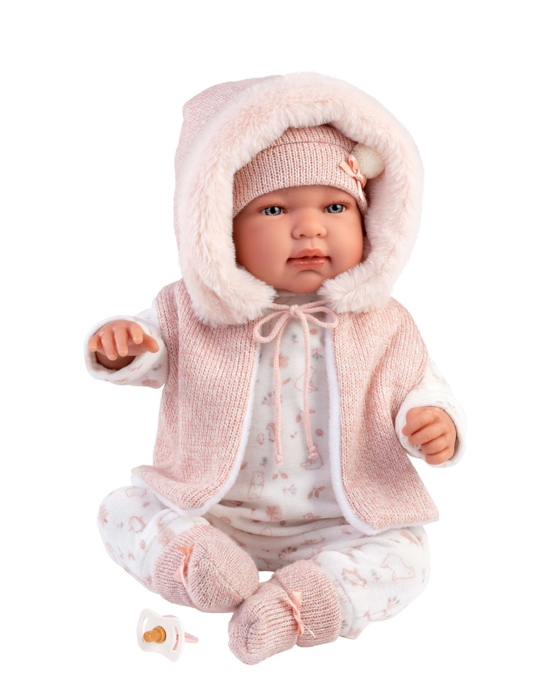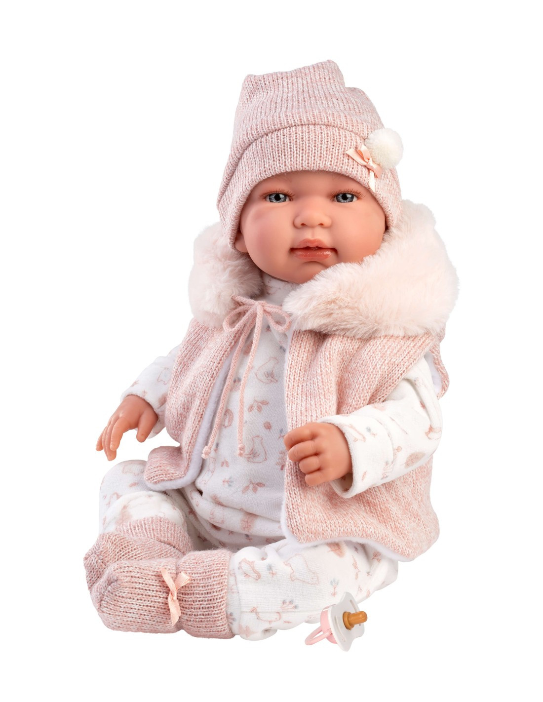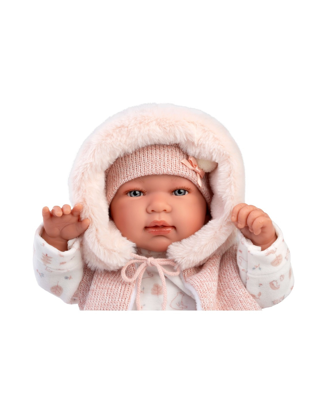 LLORENSTina es una de nuestras recién nacidas más grandes. Tiene los ojos azules y va muy abrigada con su chaleco con capucha de peluche y su pelele en tonos rosas. Tiene un cuerpo blandito con extremidades de vinilo, y si le aprietas la barriguita, llorará y llamará a mamá y papá.