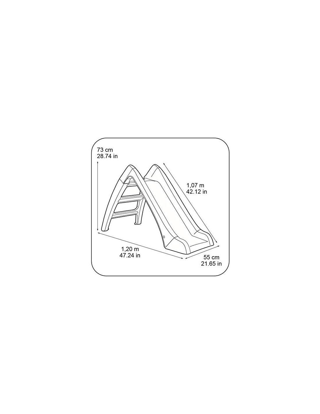 El FEBER Slide mide 120 cm de largo, 55 cm de ancho y 73 cm de altura, con una rampa de 107 cm. Estas dimensiones son perfectas para proporcionar una experiencia de deslizamiento emocionante y segura, adecuada para los niños más pequeños.