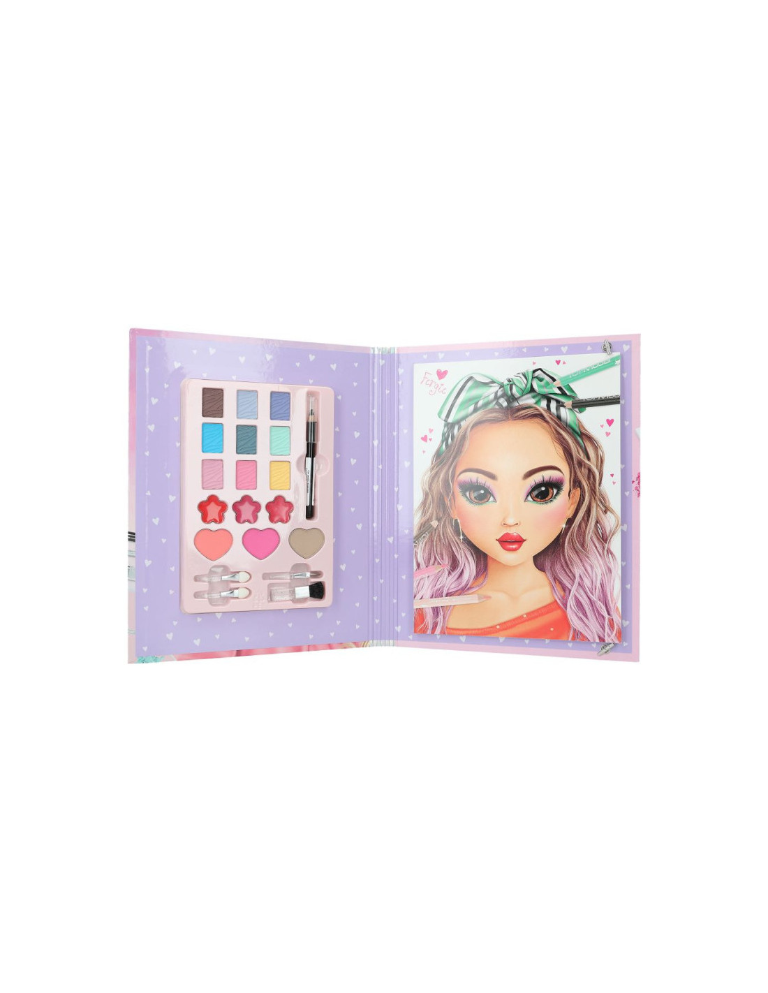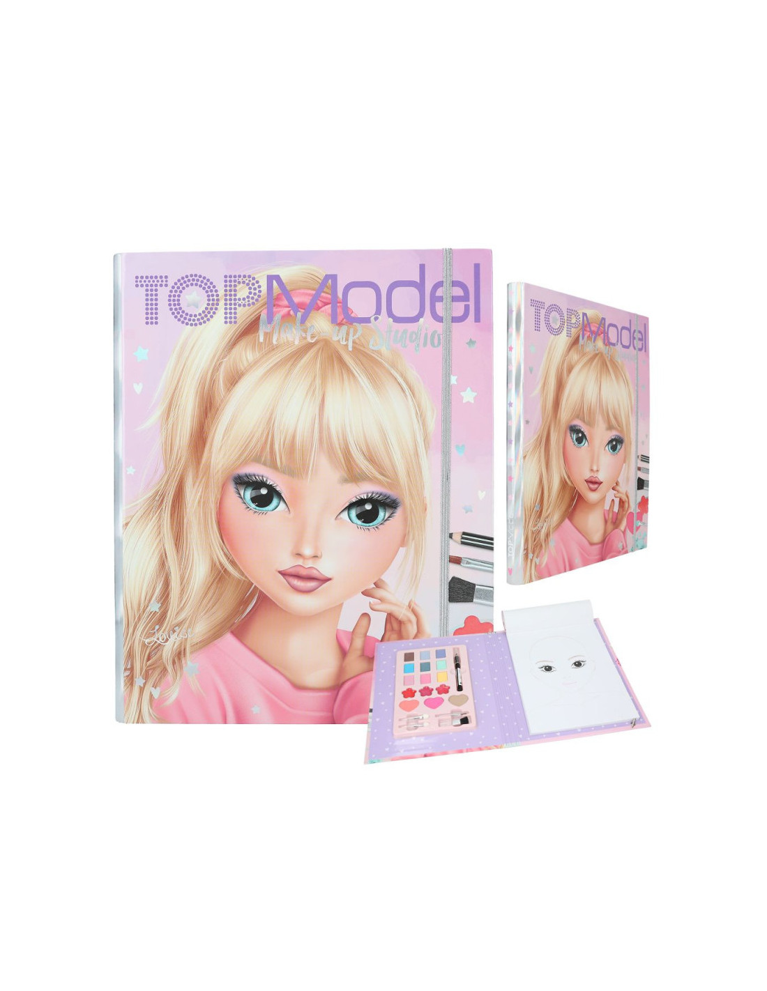 DepescheDiversión a lo grande creando maquillajes. El set Make-up Studio de TOPModel se compone de un bloc con 26 rostros de modelos para probar distintos estilos de maquillaje, ya sea con lápices para colorear o con la paleta de maquillaje que también viene incluida y que consta de 9 sombras de ojos (0,8 g), 3 coloretes (2,5 g), 3 brillos labiales (0,6 g), 1 delineador de ojos (0,9 g), 4 pinceles. Todos estos productos pueden usarse perfectamente para maquillarse una misma. La carpeta es muy estable y el set incluye también ideas inspiradoras de maquillajes e instrucciones.