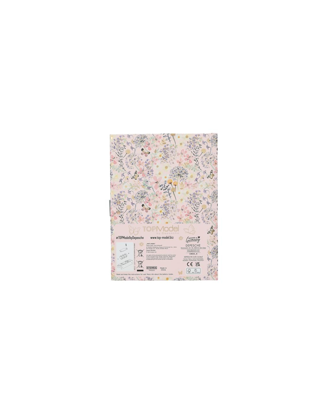 DepeschePara pensamientos y secretos. El candado de este diario de TOPModel solo se puede desbloquear introduciendo correctamente el código de cuatro cifras (personalizable y modificable). Al abrirse suena durante 20 segundos aprox. la conocida canción Anti-Hero de Taylor Swift. La portada del diario está adornada con dos modelos sobre fondo de flores y mariposas de colores suaves. En el interior encontramos 80 páginas con pauta de línea fina e ilustraciones a todo color esperando a ser escritas.
