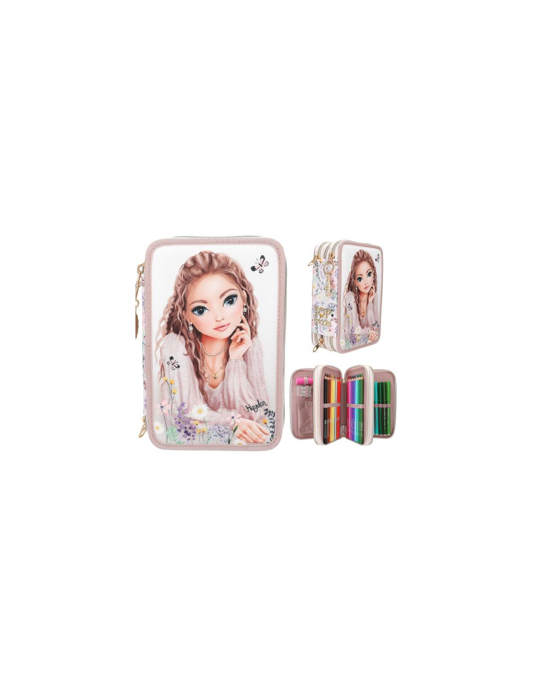 Depesche¡Fantásticamente floral! El estuche de 3 pisos de TOPModel lleva un romántico motivo de una modelo rodeada de delicadas flores y mariposas. Plus monísimo: el colgante de flor en la cremallera. Los tres compartimentos separados vienen completamente llenos con 18 lápices de colores, 18 rotuladores, 2 lápices, sacapuntas, goma de borrar, regla, tijeras y pegamento en barra; el estuche incluso va provisto de un bolsillito interior con cierre de velcro. Material: poliéster 100 por 100.