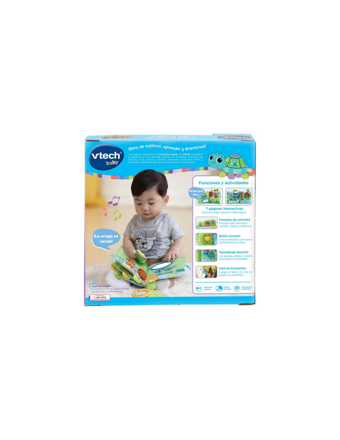 VTechSuave cuento de tela para descubrir la naturaleza y los animales. ¡Hora de explorar, aprender y divertirnos! Las páginas interactivas de Mi primer cuento de VTech sumergirán al pequeño en una divertida aventura en el bosque. Gracias a sus texturas, luces, colores y sonidos, aprenderá vocabulario, frases y canciones, además de descubrir una sorpresa en cada página.